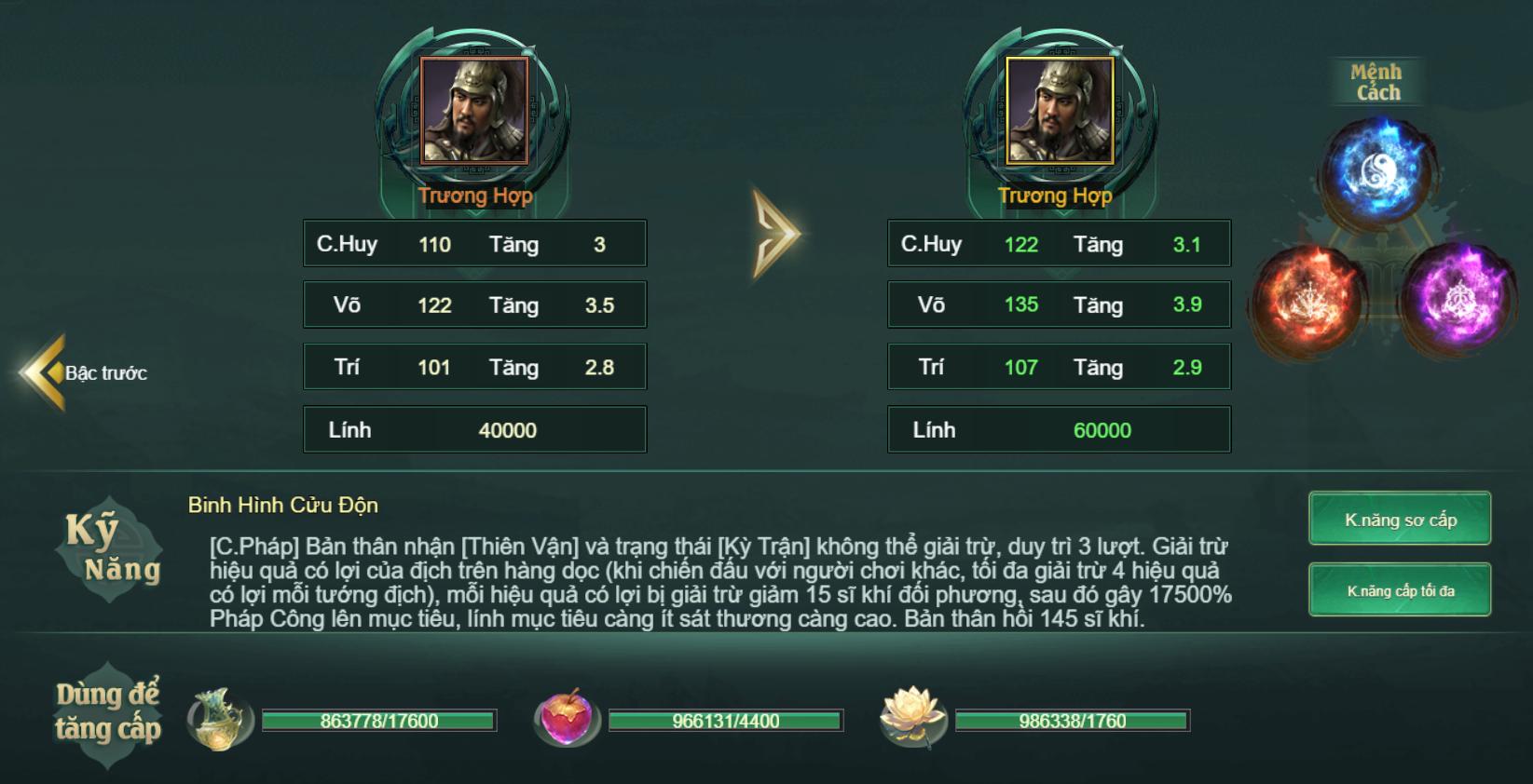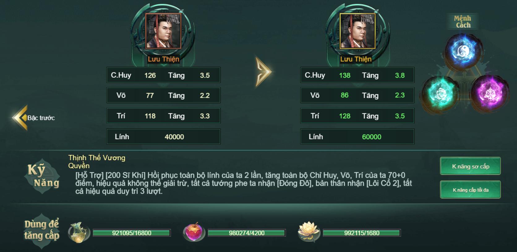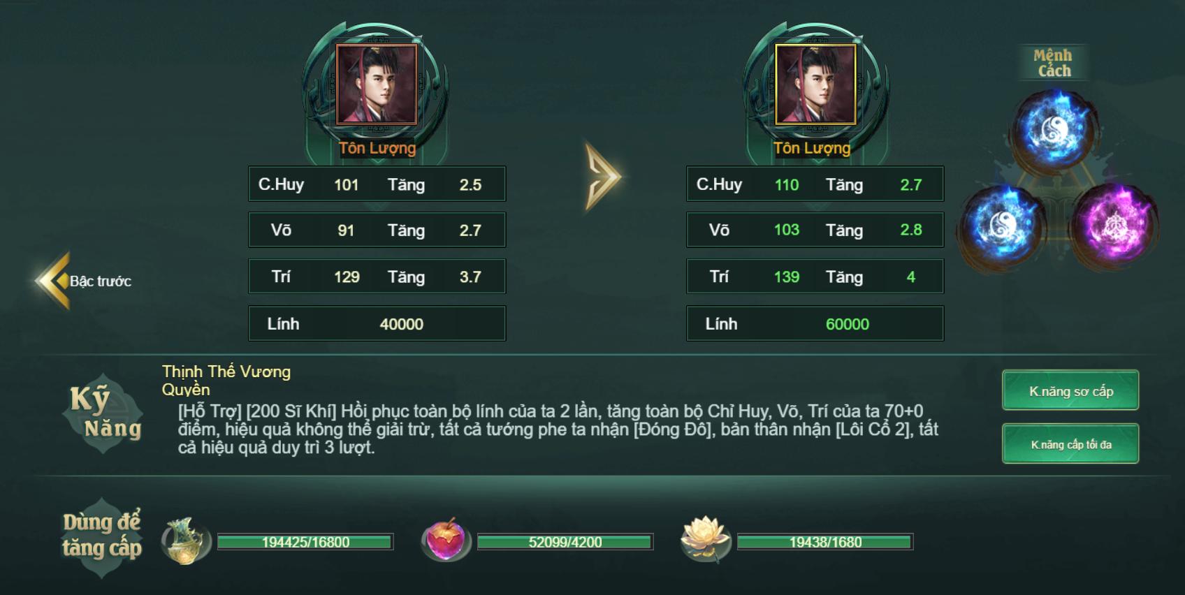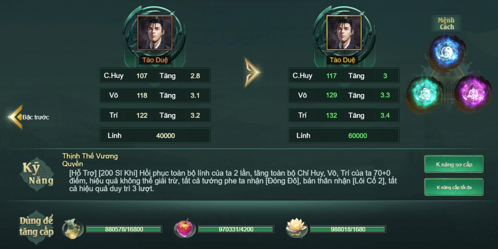 - Tướng Vàng: Thịnh Thế Vương Quyền: [Hỗ Trợ] [200 sĩ khí] Giúp toàn phe ta hồi lính 2 lần, tăng điểm C.Huy, Võ, Trí, hiệu quả không thể giải trừ. Toàn phe ta nhận hiệu quả [Đóng Đô], bản thân nhận [Lôi Cổ 2], tất cả hiệu quả duy trì 3 lượt.