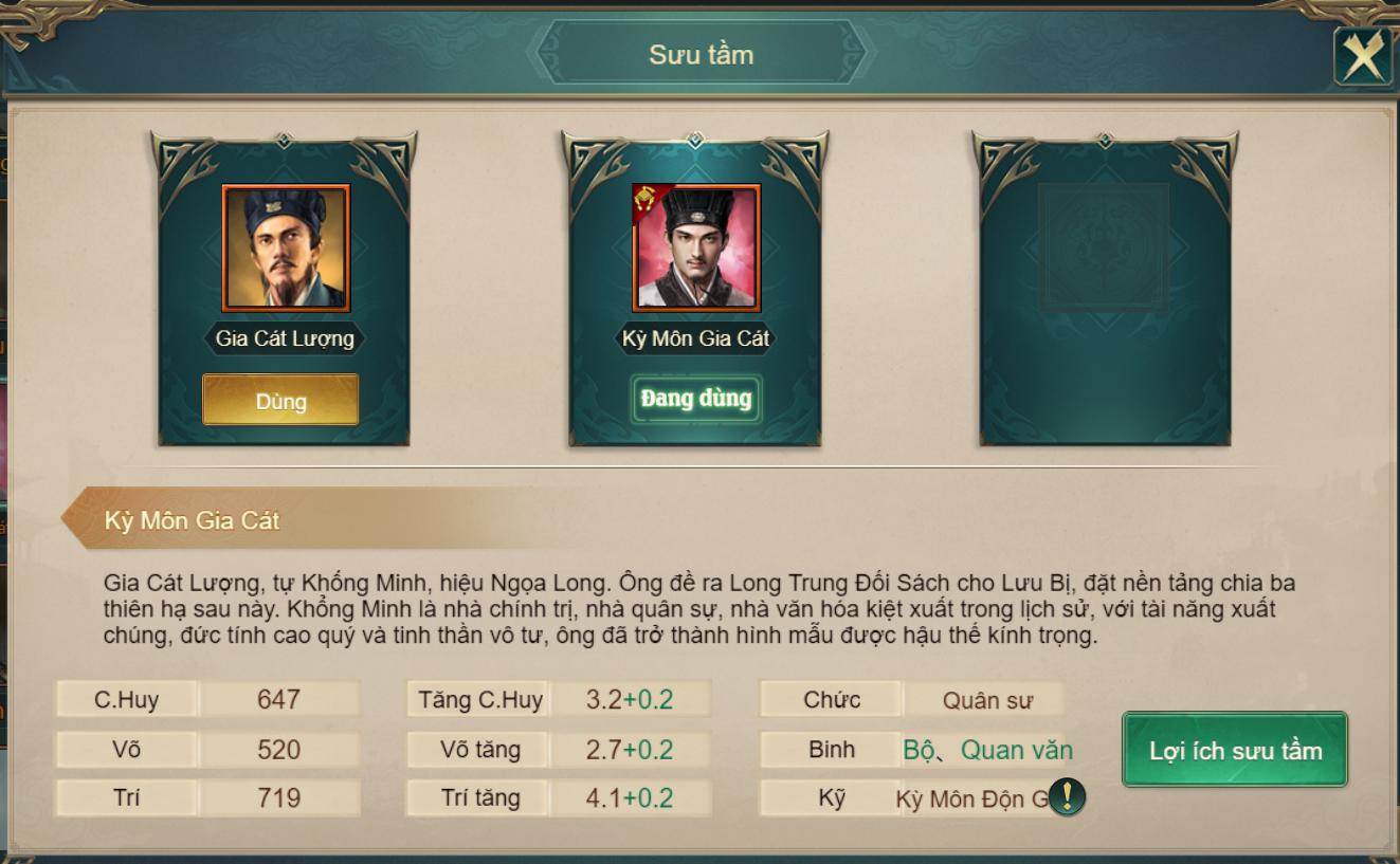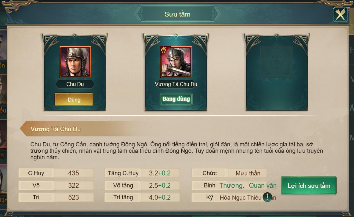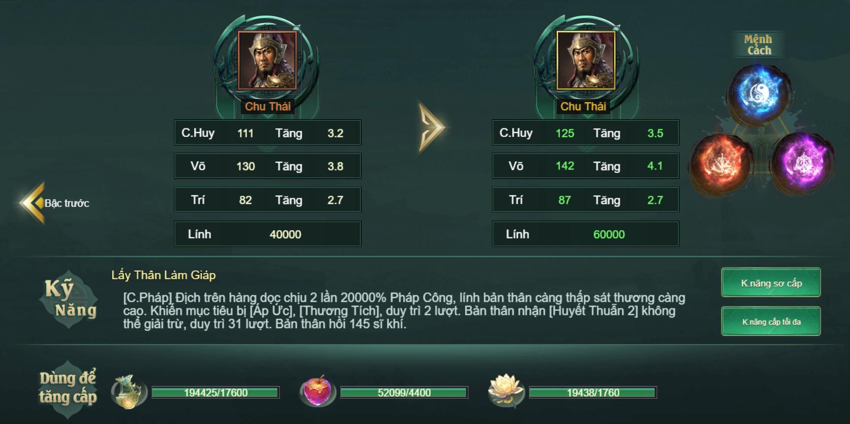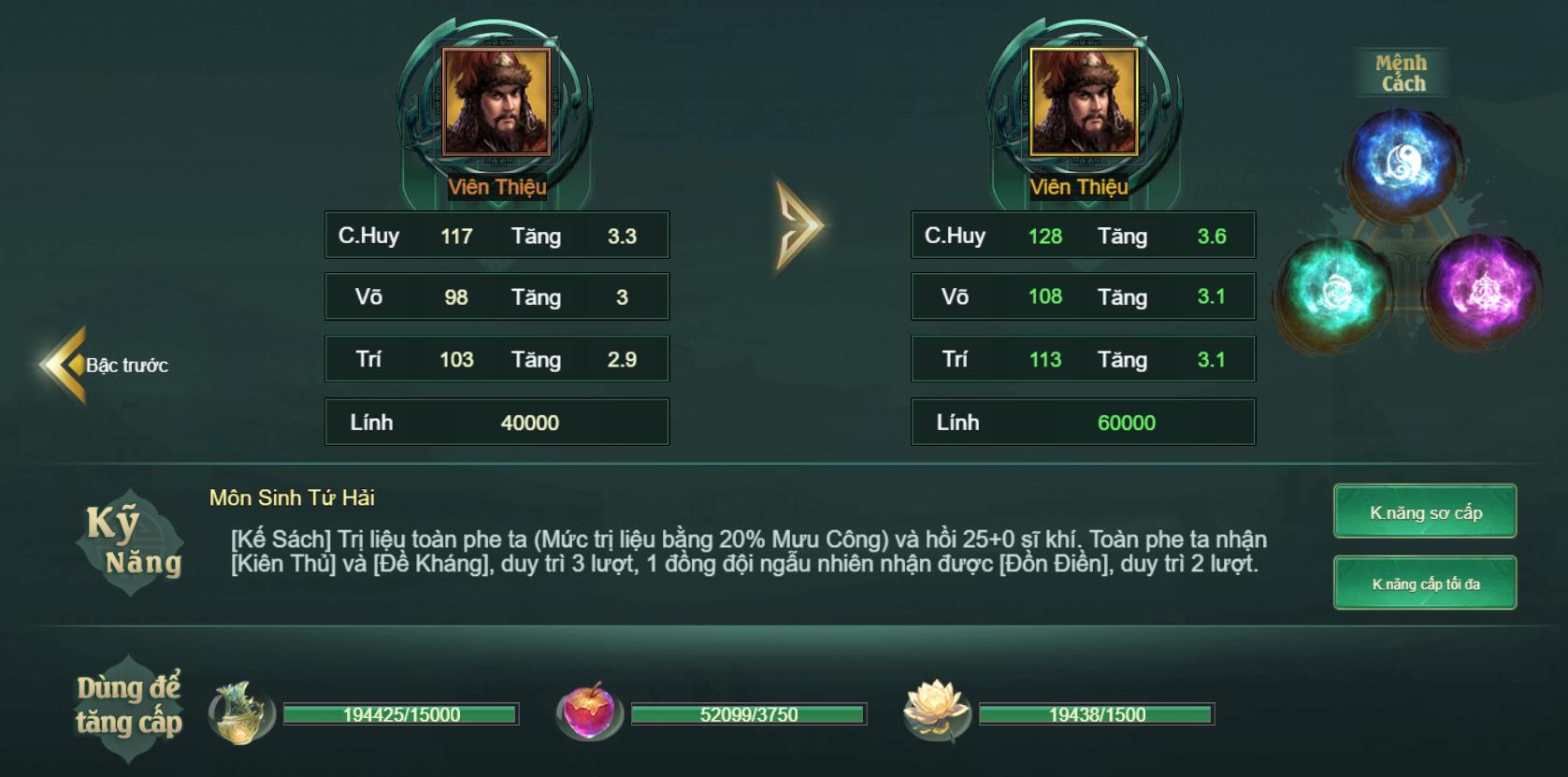 - Tướng Vàng: Thịnh Thế Vương Quyền: [Hỗ Trợ] [200 sĩ khí] Giúp toàn phe ta hồi lính 2 lần, tăng điểm C.Huy, Võ, Trí, hiệu quả không thể giải trừ. Toàn phe ta nhận hiệu quả [Đóng Đô], bản thân nhận [Lôi Cổ 2], tất cả hiệu quả duy trì 3 lượt.