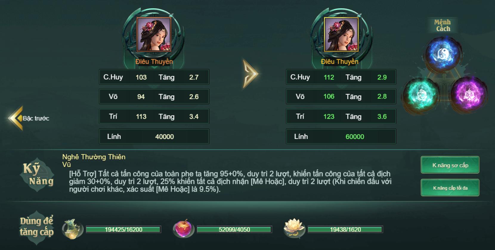 - Nghê Thường Thiên Vũ: [Hỗ Trợ] Toàn phe ta tăng 95+X% tất cả tấn công, duy trì 2 lượt, toàn phe địch giảm 30+X% tất cả tấn công, duy trì 2 lượt, 25% khiến toàn phe địch bị [Mê Hoặc], duy trì 2 lượt (Khi chiến đấu với người chơi khác, xác suất là 9.5%).