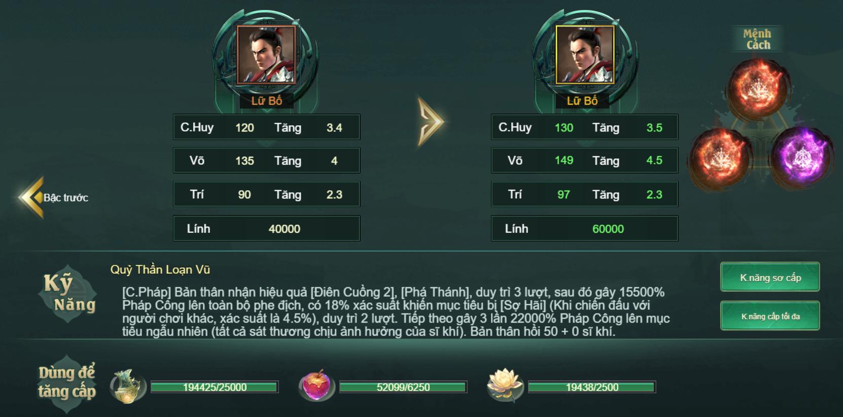 - Tăng cấp Mệnh Cách cần dùng Đá Tôi Luyện và Mệnh Hồn Luyện Ngọc, Phôi.