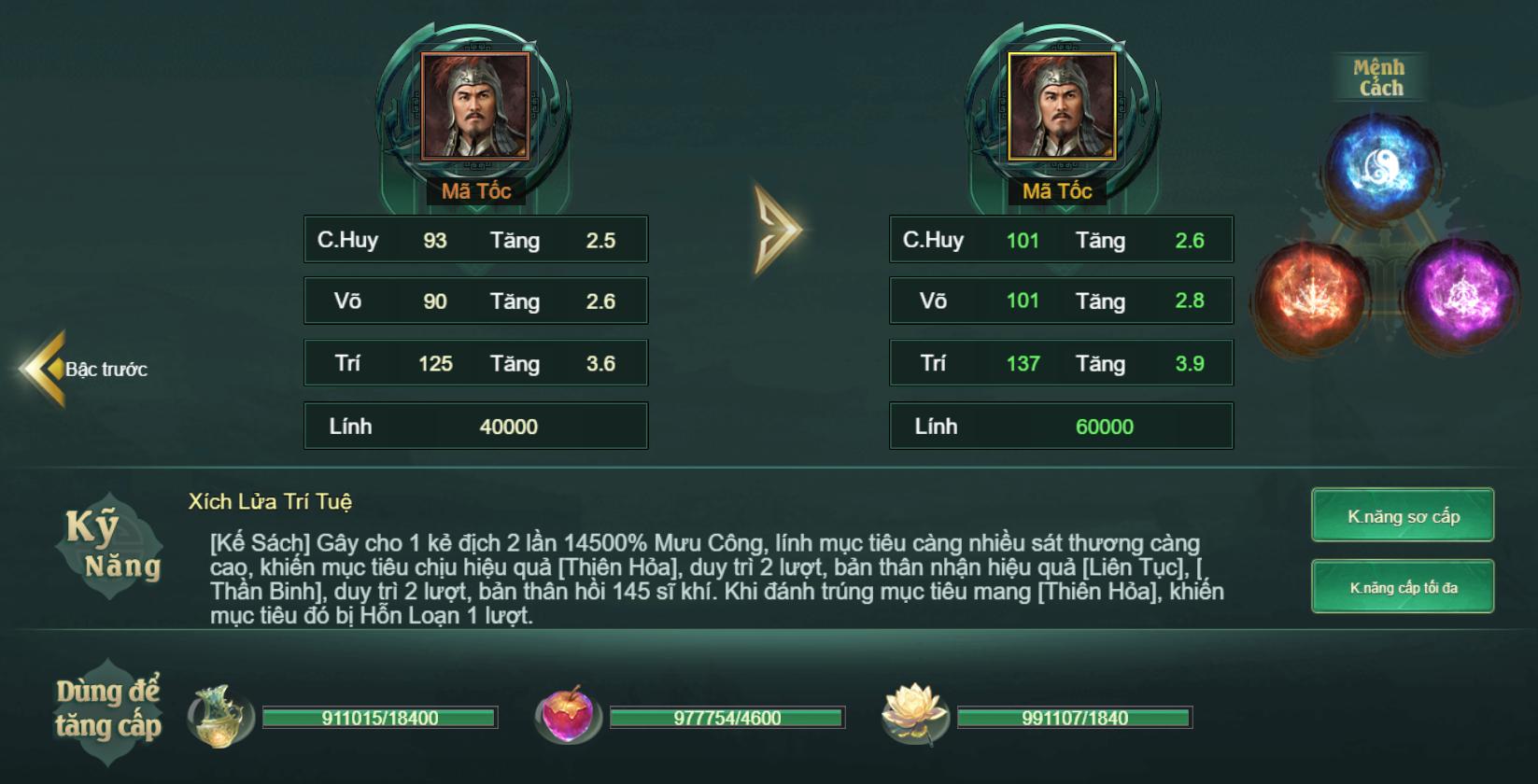 - Xích Lửa Trí Tuệ: [Kế Sách] Gây cho 1 kẻ địch 2 lần 14500% Mưu Công, lính mục tiêu càng nhiều sát thương càng cao. Khiến mục tiêu trúng [Thiên Hỏa], duy trì 2 lượt. Bản thân nhận [Liên Tục], [Thần Binh], duy trì 2 lượt. Bản thân hồi 145 sĩ khí, khi đánh trúng mục tiêu mang [Thiên Hỏa], sẽ khiến địch bị Hỗn Loạn 1 lượt.