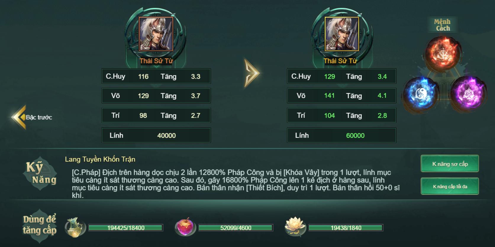 - Lang Tuyền Khốn Trận: [C.Pháp] Địch trên hàng dọc chịu 2 lần 12800% Pháp Công, kèm hiệu quả [Khóa Vây] 1 lượt, lính mục tiêu càng ít sát thương càng cao. Khiến 1 kẻ địch hàng sau chịu 16800% Pháp Công, lính mục tiêu càng ít sát thương càng cao. Bản thân nhận [Thiết Bích], duy trì 1 lượt, bản thân hồi 50+N sĩ khí.