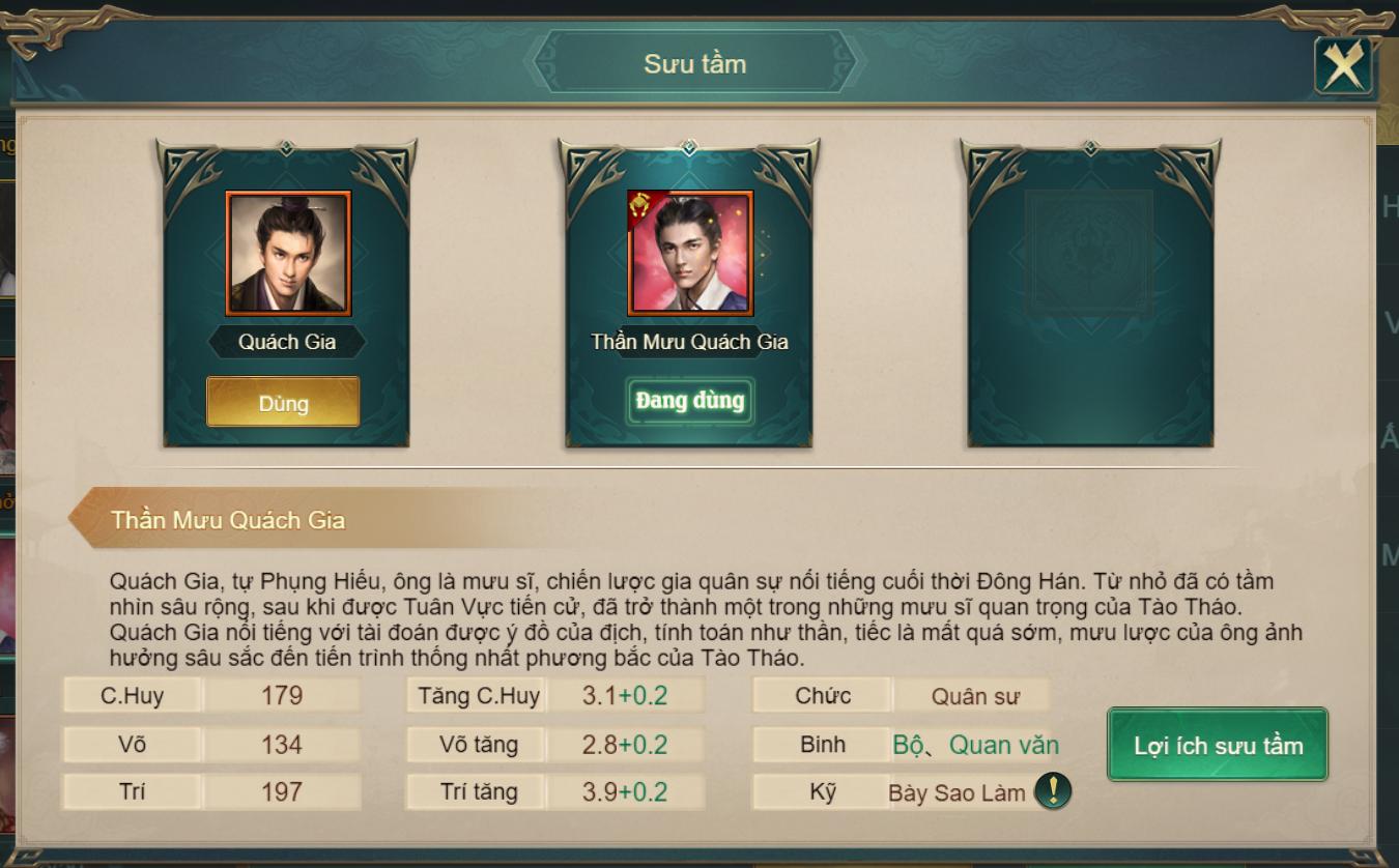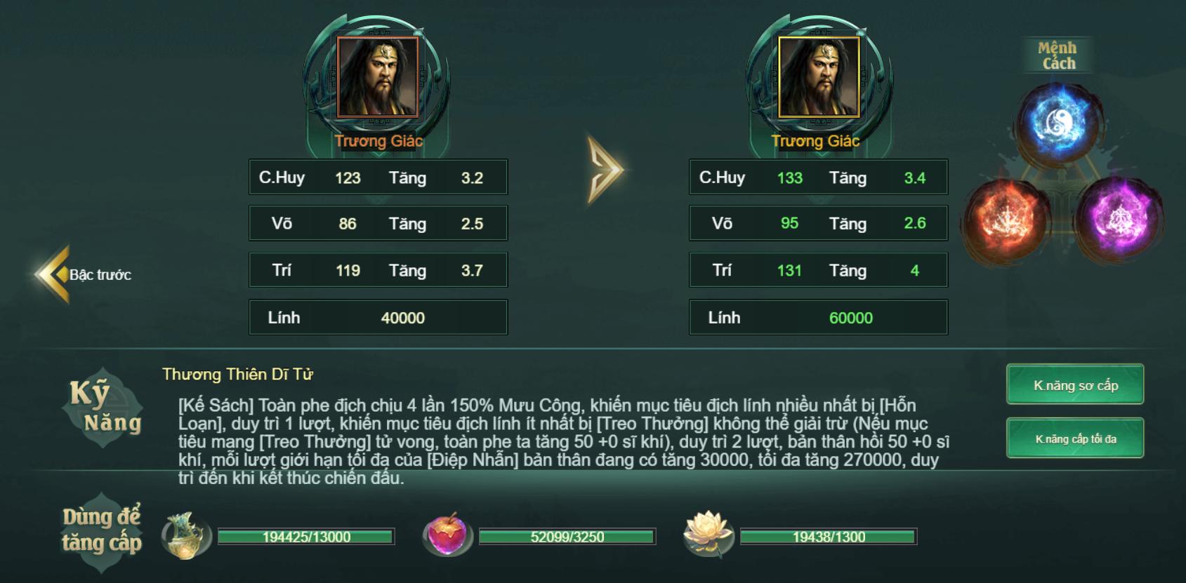 - Mỗi Tướng Vàng có 3 tùy chọn Mệnh Cách, có thể chọn 1 trong 3 để trang bị trong chiến đấu.