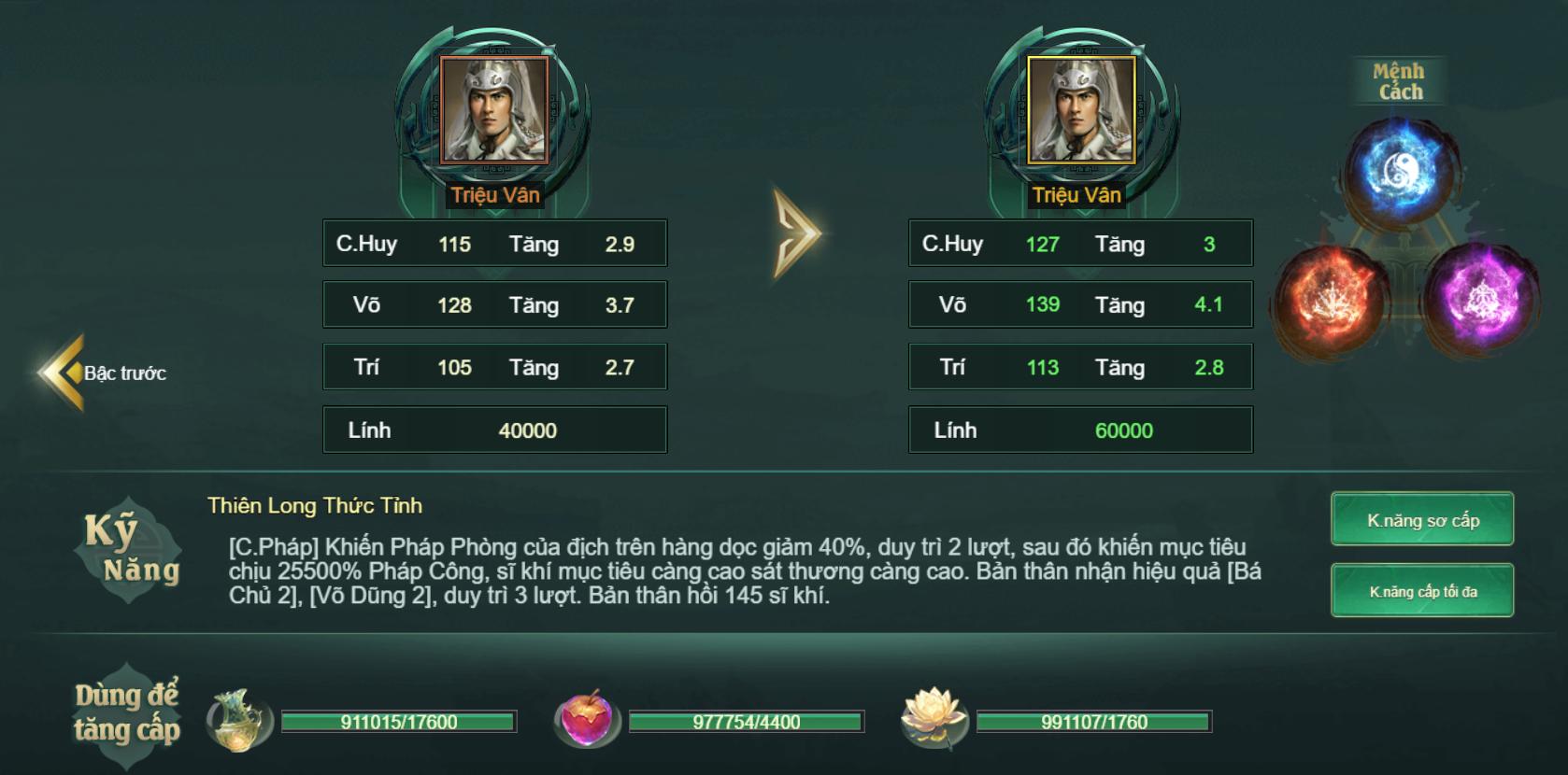 - Thiên Long Thức Tỉnh: [C.Pháp] Địch trên hàng dọc Pháp Phòng giảm 40%, duy trì 2 lượt, sau đó khiến mục tiêu chịu 25500% Pháp Công, sĩ khí mục tiêu càng cao sát thương càng cao. Bản thân nhận [Bá Chủ 2] [Võ Dũng 2], duy trì 3 lượt, bản thân hồi 145 sĩ khí.