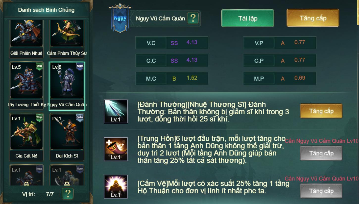 Đánh Thường: Tấn công một kẻ địch, tăng cho toàn phe ta (2%, 3%, 4%, 5%, 6%) Đề Kháng, duy trì 3 lượt, toàn phe ta hồi (15, 20, 25, 30, 35) sĩ khí.