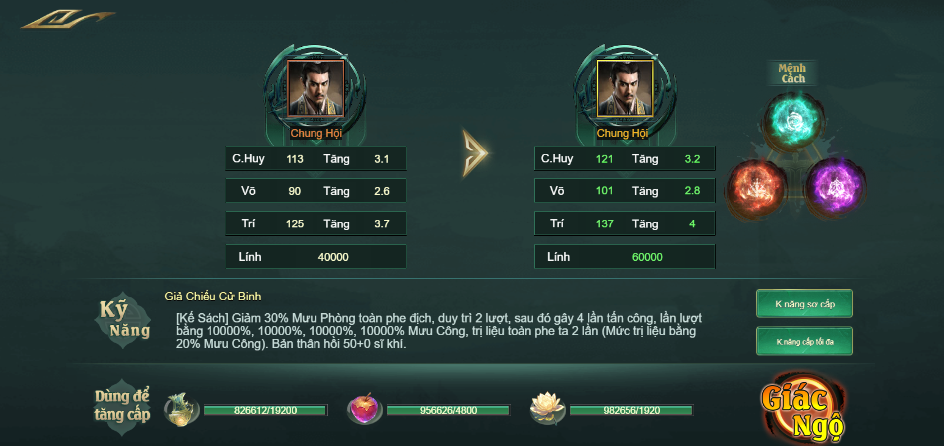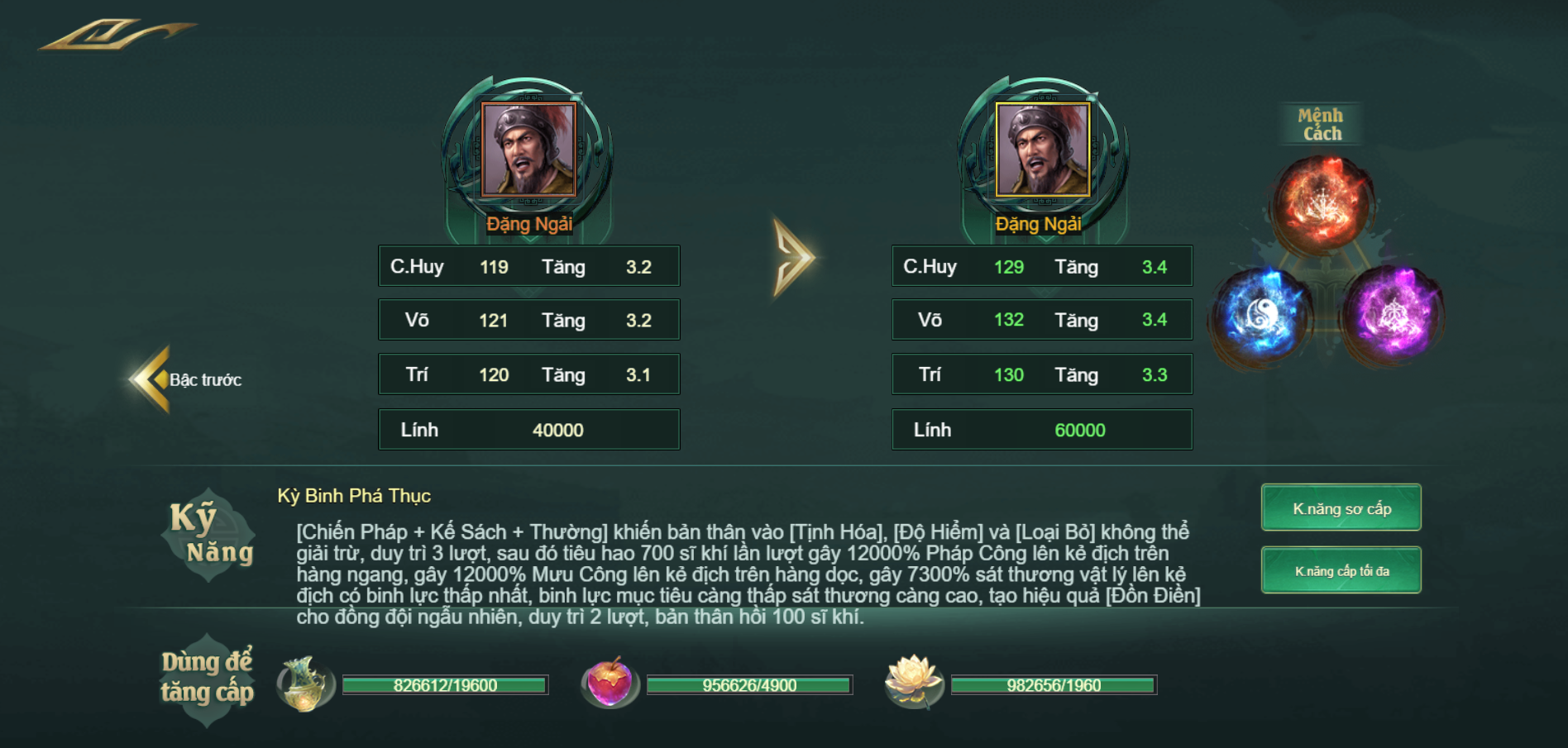 - Mệnh Cách: ① Tuốt Gươm Giương Nỏ (Tấn công); ② Tường Đồng Vách Sắt (Phòng thủ).