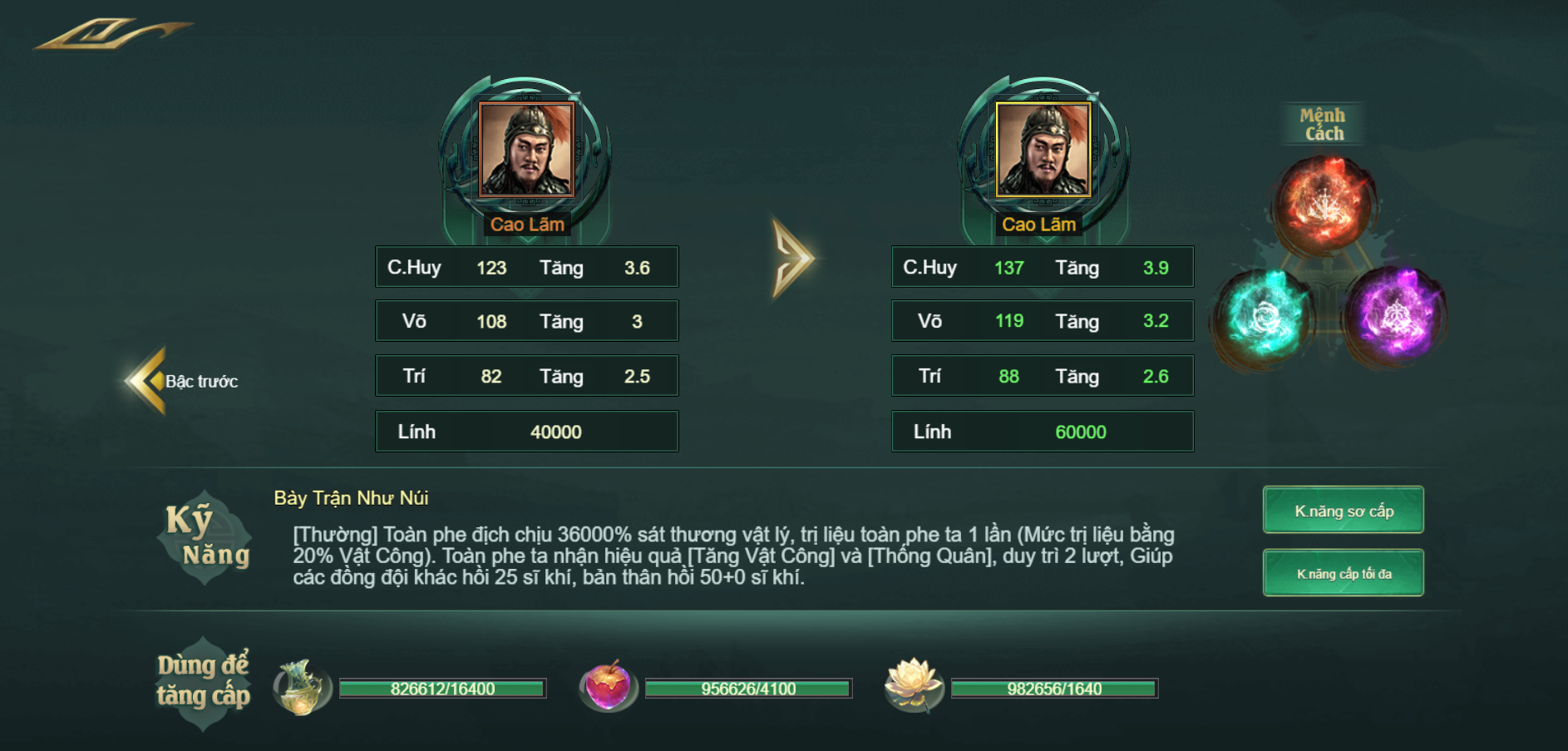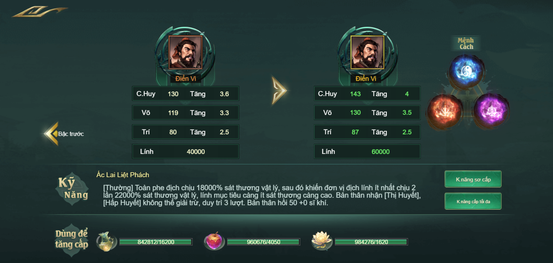 - Mệnh Cách: ① Bài Sơn Đảo Hải (Tấn công); ②Nghiêm Chỉnh (Phòng thủ).