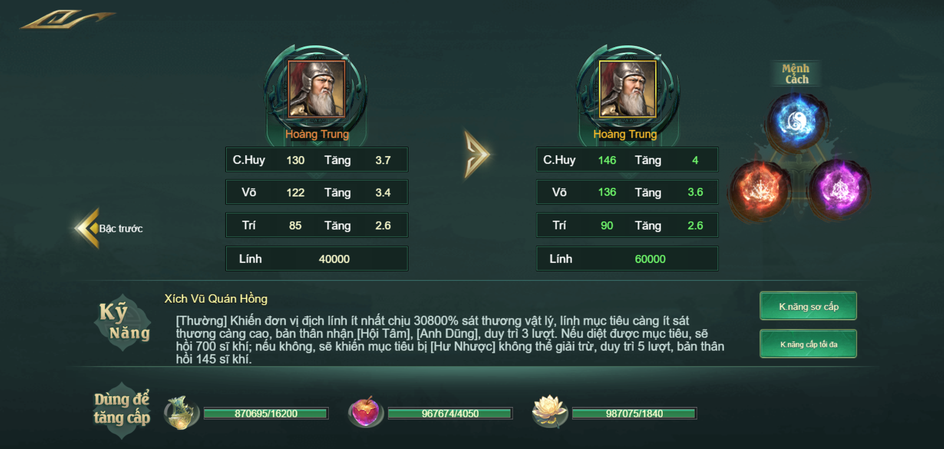 - Mở Đập Bình Mệnh Cách, tạo Quỳnh Tương, Xích Quả, Hoàng Trung Lý có thể dùng để giác ngộ Tướng Vàng.